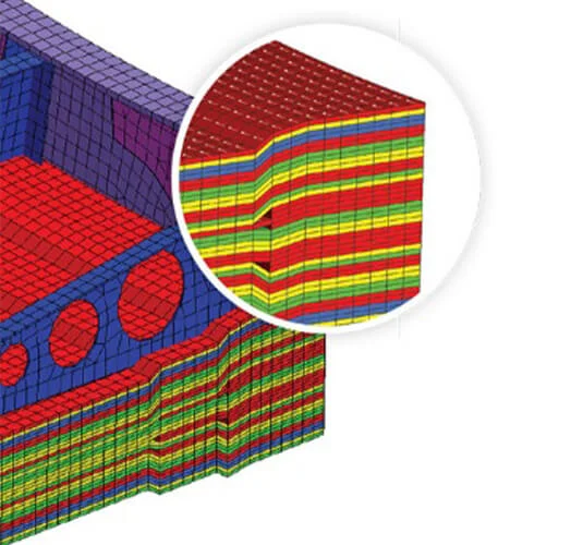 Simulate, optimize, and innovate with advanced composite simulation solutions. Using cutting-edge finite element analysis (FEA), predict the behavior of layered materials under complex loads. Composite structures, built from distinct fiber and resin constituents, require precise composite simulation of laminate interactions, ply orientations, and stacking sequences for structural integrity and lightweight, high-performance designs.